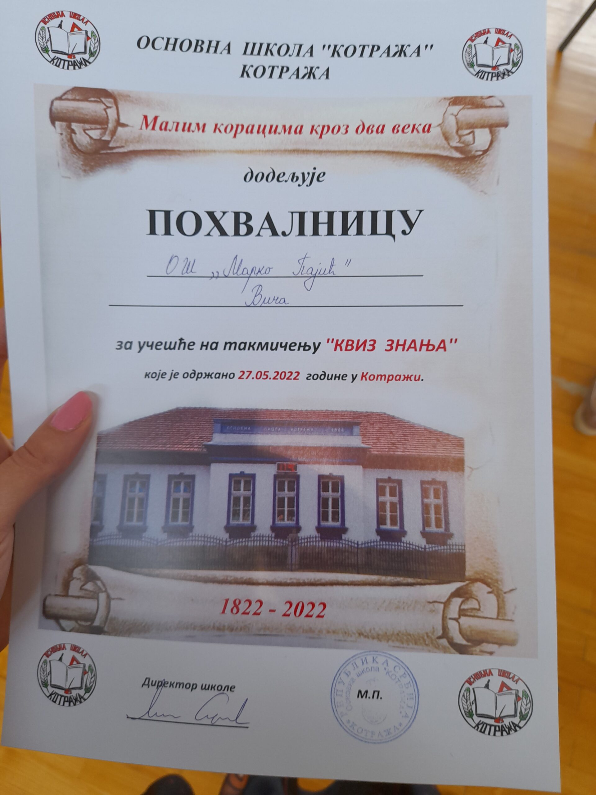 Ове године Основна школа „Котража“ прославила је јубилеј, тачније двеста година постојања, а наши ученици: Лука Тадић, Јелена Ковачевић, Илија Чакаревић, Маријана Главоњић и Алекса Јоровић били су почасни гости и учесници у Квизу знања. У Квизу су се такође такмичили домаћини, ученици Основне школе „Милан Благојевић“ из Лучана, као и ученици Основне школе „Вук Караџић“ из Каоне. Сви су показали завидна знања из области матерњег језика, историје, географије и биологије, а ми се можемо похвалити великим другим местом.